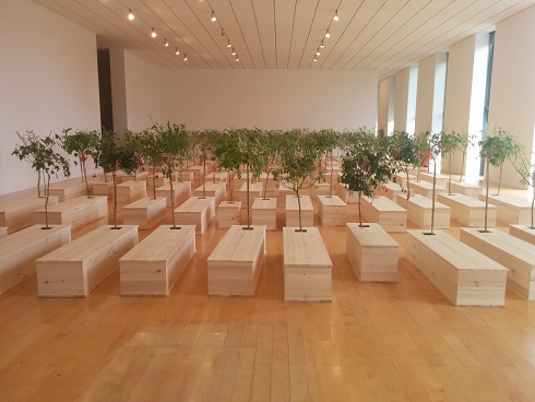 Par opposition à cette réalité insupportable, elle nous propose de nous élever, « Skyladders », pour rêver, et espérer que les combats cessent, témoin « Helmets », casques de la Seconde guerre mondiale, pendant du plafond, retournés et contenant des pièces du puzzle représentant le ciel. Même ce spectaculaire alignement de cercueils en bois clair, « Ex It », inspire plutôt l’espérance et la renaissance, grâce à ces arbres qui en émergent, comme d’une terre nourricière, et symbolisent la vie qui reprend le dessus, quoi qu’il arrive.