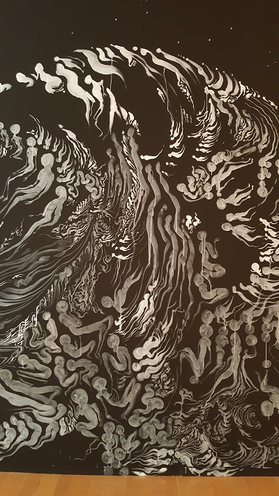 Comme son nom l’indique, cette exposition initiée et portée par le Street artiste Julien Malland alias Seth – il en est l’un des deux commissaires – nous montre des oeuvres monumentales peintes sur les murs du MAC. Elles ont été réalisées sur place par une dizaine de créateurs avec qui Seth a travaillé lors d’un tour du monde à la rencontre d’artistes de cultures différentes et qu’il a invités non seulement à se produire au MAC mais aussi à intervenir dans la ville, tous les lieux étant indiqués dans la documentation fournie par le musée. Son choix s’est porté sur des artistes « qui tous mêlent dans leur pratique, art urbain et traditions ancestrales, chacun puisant dans les mythes fondateurs, les légendes indigènes ou encore les faits politiques marquants qui ont façonné leur territoire, entre savoir-faire locaux et globalisation. »