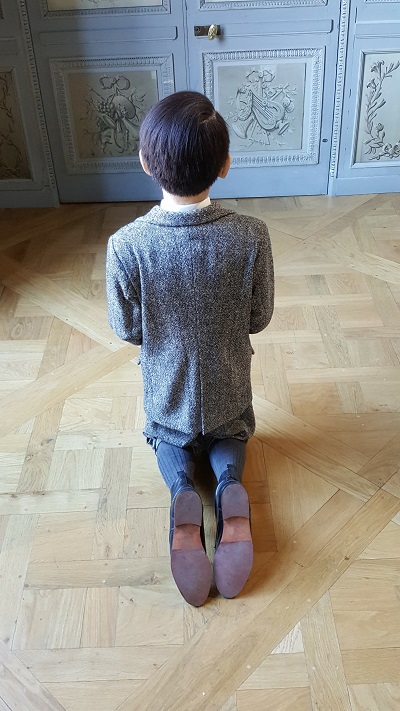 De pièce en pièce on s’étonne, on se retourne, on sourit ; sans s’habituer, on rentre dans cet univers fait de provocation, d’humour, d’interpellation, d’extrême qualité de fabrication, jusqu’à ce jeune garçon vêtu d’un costume de flanelle et de knickerbockers des années 30, de dos, agenouillé dans une attitude pieuse. La sensation est d’autant plus forte que cette dernière pièce est comme une impasse forçant le visiteur à en faire le tour et se retourner pour faire face au personnage : Adolf Hitler dans une attitude de repentance.