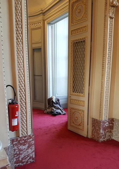 Et vient rapidement le moment de la réflexion, du questionnement ou de la simple évidence comme pour cette sculpture tapie dans un recoin, que l’on ne voit pas immédiatement car mise à l’écart comme dans un souci de dissimulation, et qui confronte violemment les ors de ce palais somptueux et la détresse du mendiant jeté à la rue.