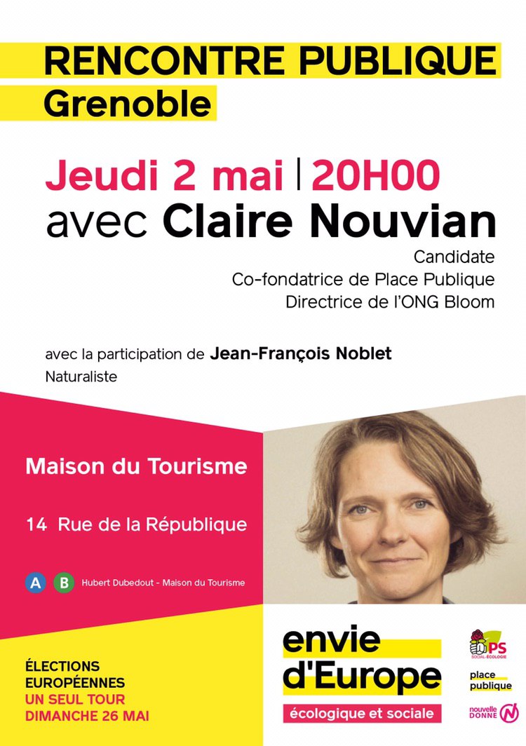 Co-fondatrice de Place Publique et infatigable fondatrice et militante de l’Association Bloom – qui a ces deux dernières années obtenu l’arrêt du chalutage profond et de la pèche électrique – sera présente à Grenoble le 2 Mai dans le cadre d’une Rencontre Publique, à 20h à l’Amphithéâtre de la Maison du Tourisme.